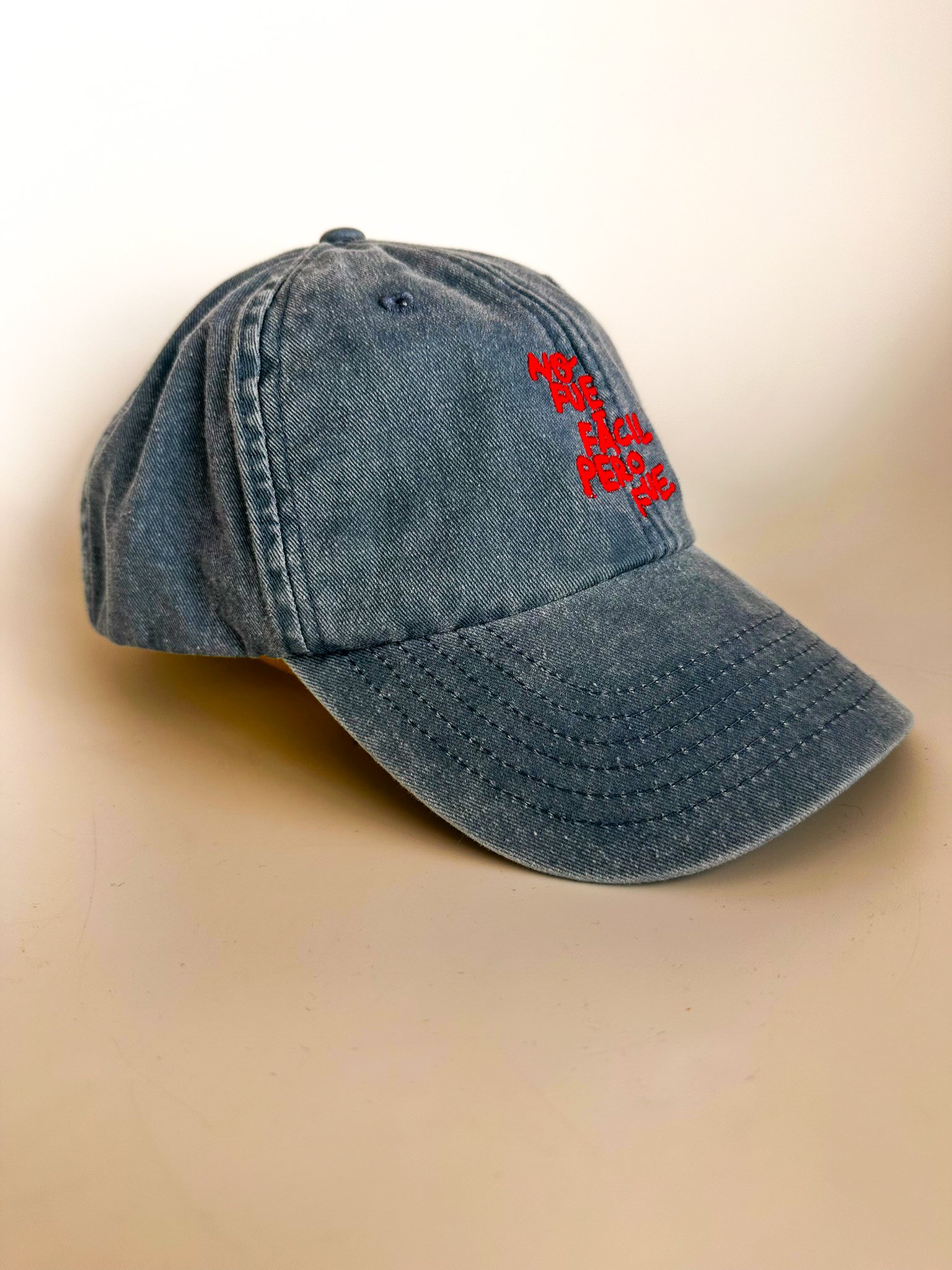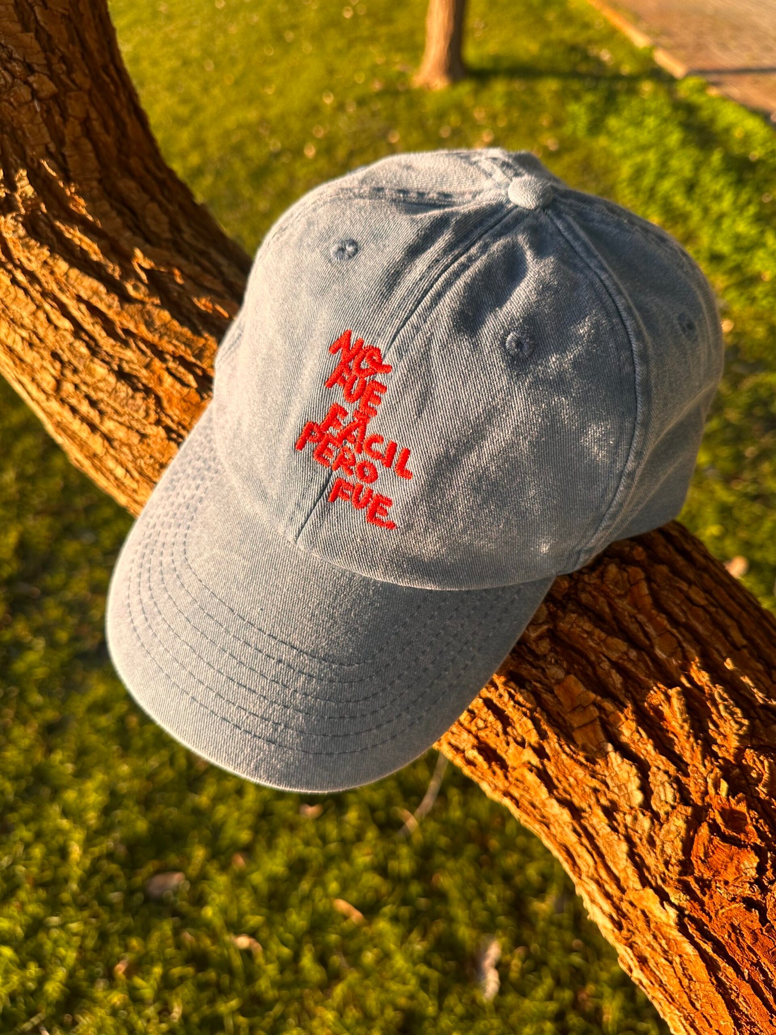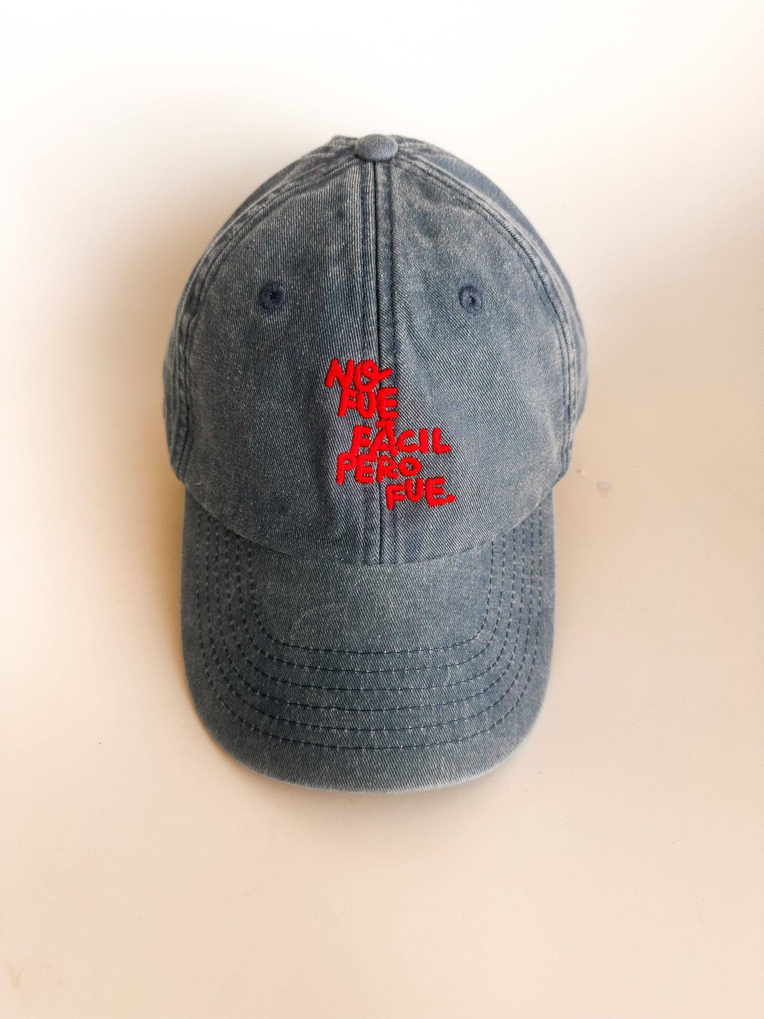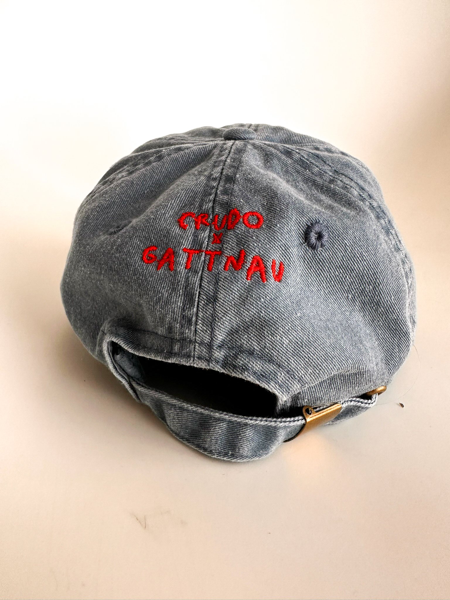 Azul desgastado, vibe de camino largo, cicatriz bien curada y ese bordado rojo–fuego que grita desde lejos:
